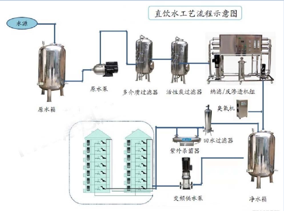 自來水-加壓泵-多介質過濾器-活性炭過濾器-保安過濾器-反滲透主機-不銹鋼儲水罐-紫外線殺菌器(臭氧發生器)-精密過濾器-變頻恒壓供水泵-供水管道
